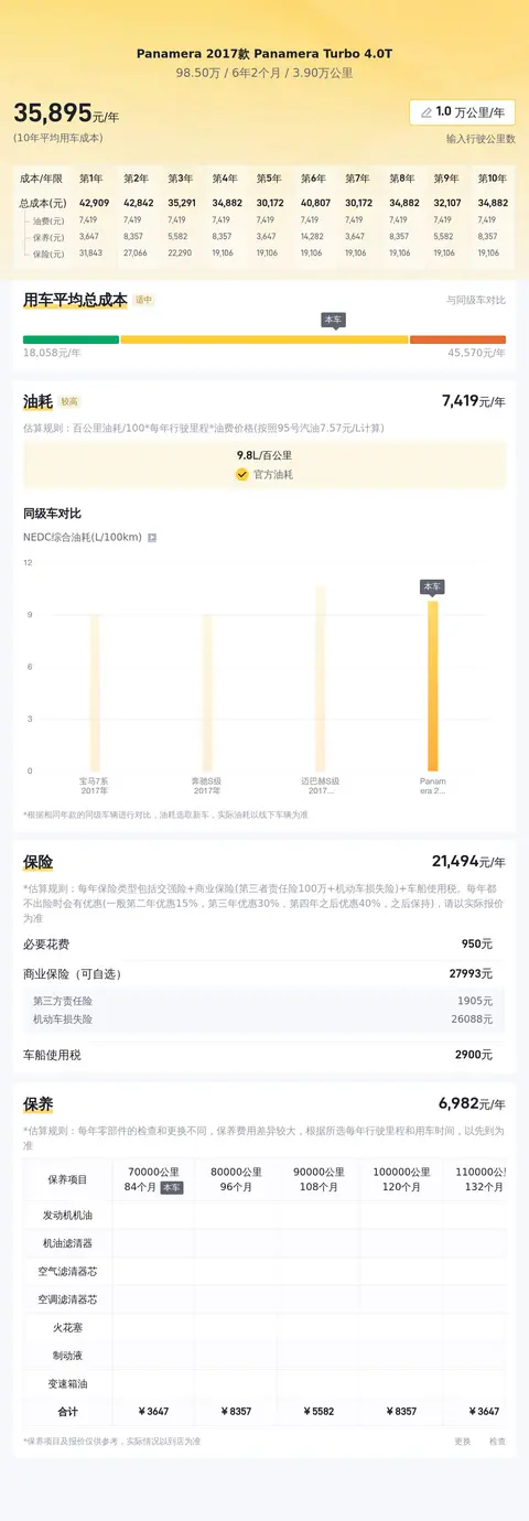 此外,同级车的最低10年平均用车成本是13144元/年,最高是40020元/年,Panamera 2017款 Panamera Turbo 4.0T是35780元/年,用车成本也较高。
