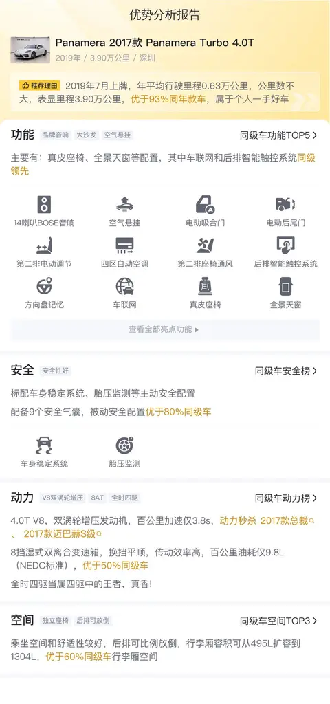 优势:Panamera 2017款 Panamera Turbo 4.0T的加速性能卓越,从静止加速至100km/h仅需3.8秒,展现了强大的动力储备。其外观设计融合了跑车元素与轿车的优雅,辨识度很高。内饰做工精细,运用了高品质材料,并配备了智能科技,如触摸屏控制系统,提升了驾乘体验。动力强劲,搭载的4.0升V8双涡轮增压发动机,提供了迅猛的加速性能和高速行驶能力。刹车系统响应迅速,能够有效缩短制动距离,提升了安全性。新车时的价格较高,但作为二手车,Panamera 2017款 Panamera Turbo 4.0T的性价比还不错。