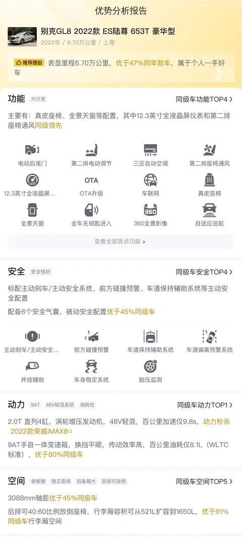 优势:作为MPV的扛把子,别克GL8名气在外,市场欢迎度高,保值率也高。车子用得不多,跑得也不算远,整体较新,性能状态稳定。配置丰富,每一项都很实用,空间大,舒适性高,家用首选。