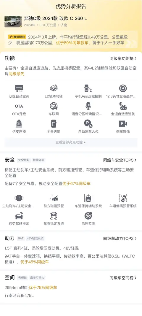 今天我们要介绍的这款车,是2024年3月在济南上牌的奔驰C级 2024款 改款 C 260 L,白色外观,内饰保养良好,搭载1.5T 直列4缸,涡轮增压发动机,48V轻混,9AT手自一体变速箱,百公里油耗仅6.5L(WLTC标准),是一款性价比不错的二手豪华车。