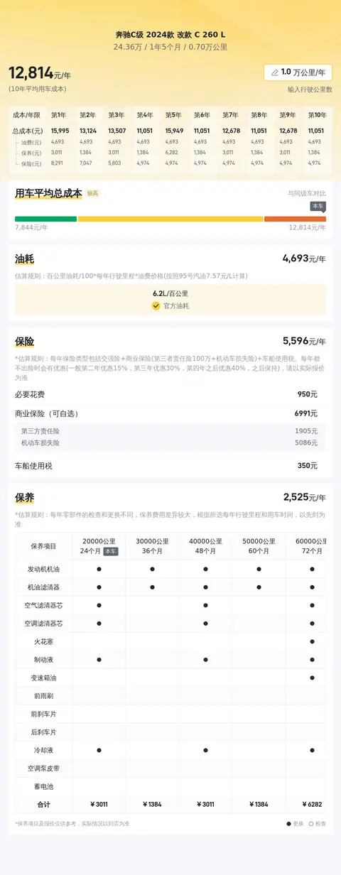 按照每年2万公里的行驶里程计算,这辆奔驰C级 2024款 改款 C 260 L的年均综合用车成本约为2.58万元,其中包括油费、保险费和保养费等开支。这一用车成本在同级别车型中处于合理范围内。