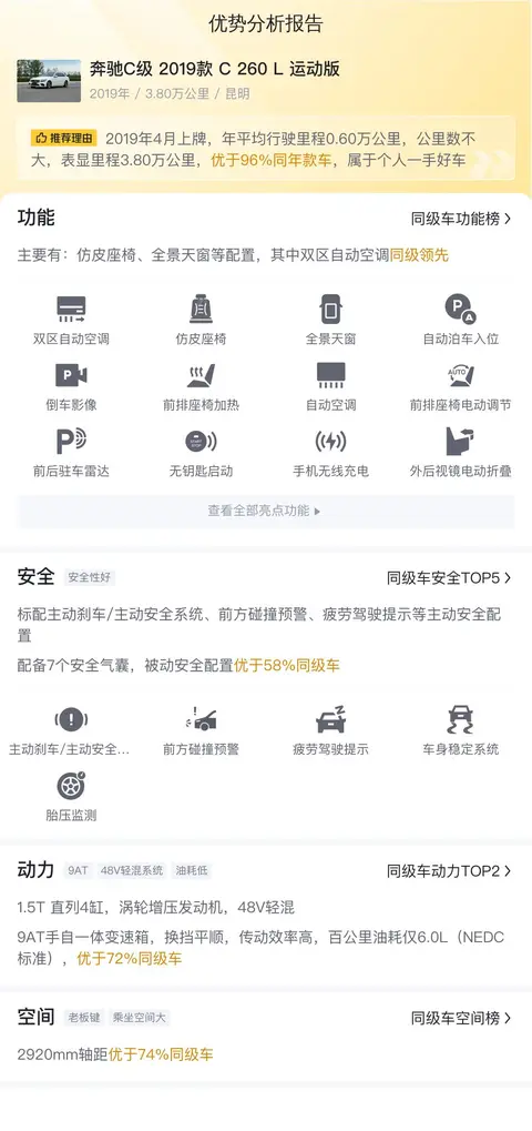 综上所述,这款车在各个方面都有着出色的表现。它拥有优雅的外观设计、精致的内饰做工、充沛的动力输出以及丰富的舒适和智能配置。这些特点共同构成了这款车的核心竞争力。尽管是一款二手车,但其整体车况和性能表现仍然值得消费者信赖。如果您正在寻找一款兼具豪华感和性价比的中型轿车,那么这款奔驰C级 2019款 C 260 L 运动版或许会是一个不错的选择。