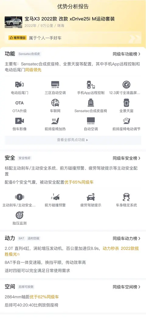 综上所述的新车含税价、用车成本、市场行情、优势分析、同款比价等数据仅供参考。在配置部分,因为二手车非标品,车辆可能会存在配置改装的情况,具体车况信息需要线下结合车辆实际情况进行综合参考。
