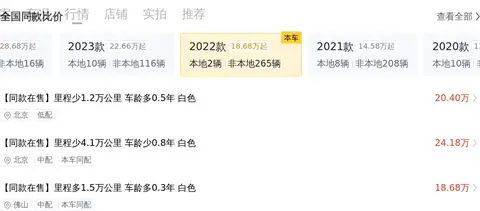 二手车一车一况,一况一价,对于一台二手车的价格是否合适,需要综合这台车的车况、里程数、使用年限等因素综合评判,为了帮您更加直观的判断这台车的价格是否合理,我们统计了全国范围内销售的同款车型的二手价格,让您可以从各个角度更加清楚的了解到这台车在全国同款二手车市场上的价格水平如何。
