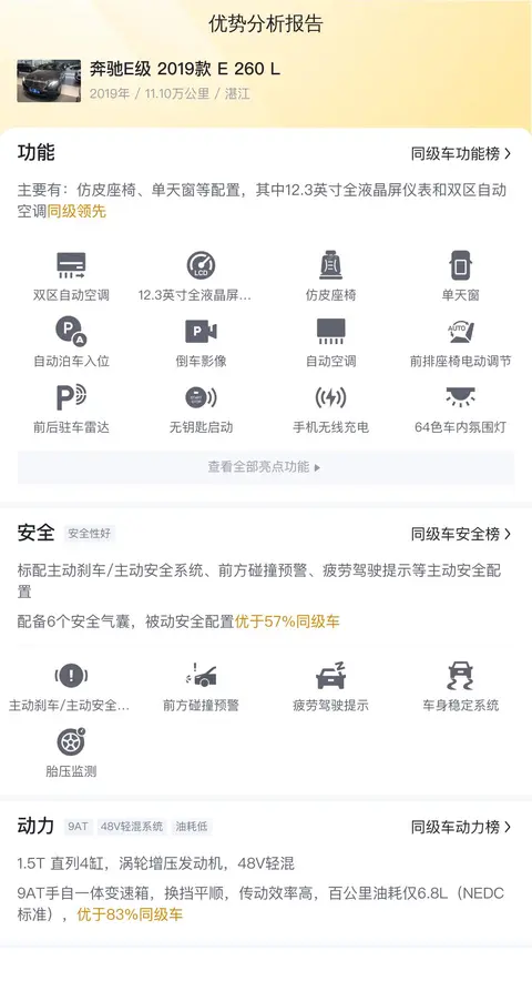 在功能配置方面,这款奔驰E级同样表现出色。它采用了仿皮座椅、单天窗等配置,其中12.3英寸全液晶屏仪表和双区自动空调更是同级领先。无论是驾驶还是乘坐,都能感受到奔驰品牌一贯的高品质和舒适感。