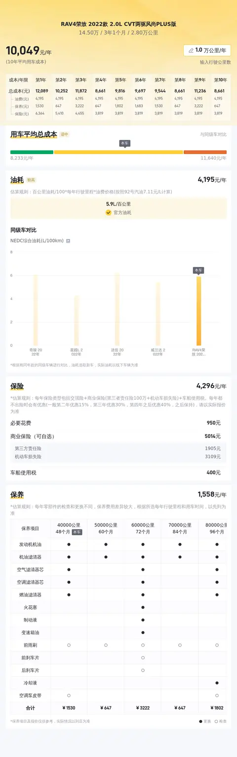 在用车成本方面,根据估算,这辆RAV4荣放的年均综合用车成本大约为每年10,140元,这一成本在同级别车型中属于合理范围。值得注意的是,车辆的实际使用成本会因个人用车习惯、地区消费水平等因素而有所差异。