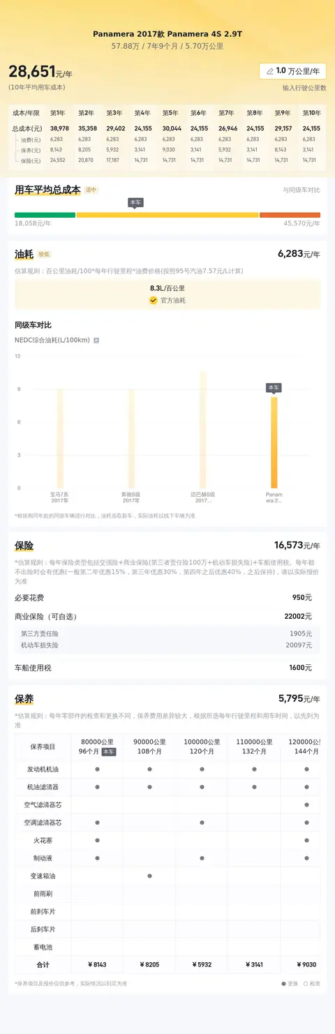 在用车成本方面,根据懂车帝官方大数据分析,这辆车的10年平均用车成本大约为28645元/年,是一个比较合理的水平。