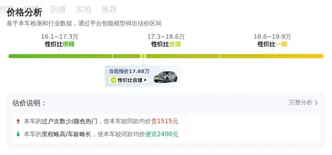 根据大数据预估显示,这辆车的市场价在17.01-20.65万之间,具体的售价因车况而有所不同,这辆车的报价17.68万,车况正常的情况下性价比还是很高的,保值率也比较高。