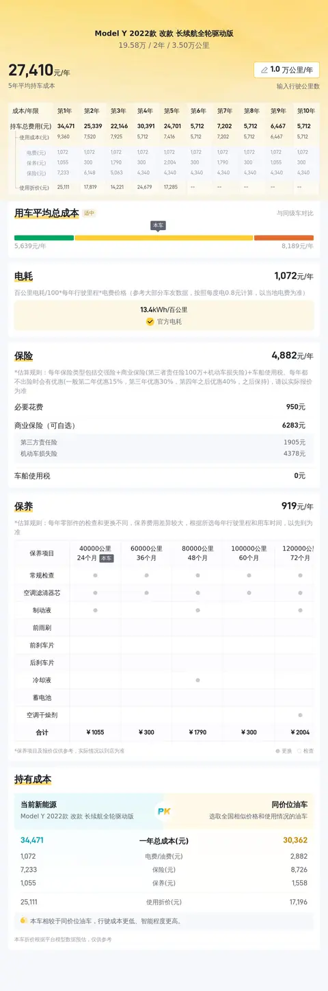 这辆二手Model Y 2022款 改款 长续航全轮驱动版年均综合用车成本约2.7万元,包括电费、保险费和保养费。懂车帝平台数据显示,与同价位油车用车成本相比,这辆车每年可节省约1.2万元,经济性较好。