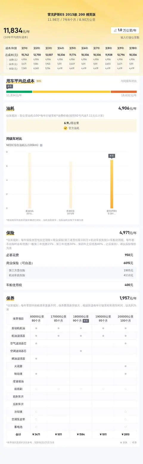 根据懂车帝大数据分析,这辆二手雷克萨斯ES 2015款 200 精英版的售价在11.77-14.52万之间,而我们的定价为11.98万,相较于其他车源,具有明显的价格优势。且本车价格低于全国售价底价的43%,是一个非常难得的购车机会。作为一辆二手车,它的售价相较于新车含税价优惠高达18.52万。在用车成本方面,这款车的表现同样出色。百公里油耗仅为6.9L,按照每年行驶2.5万公里计算,每年的油费支出约为5663元,相较于同级别车型来说,这是一个非常合理的油耗水平。年保险费用约为4600元,年保养费用约为1371元,这些费用都属于常规保养范畴,不会给车主带来过大的经济压力。综合来看,这款车的用车成本相对较低,适合广大消费者购买和使用。