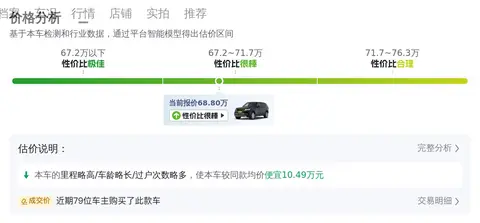 懂车帝平台数据显示,在已成交的同款车型中,最低成交价为68万,最高成交价为98.2万,平均成交价为80.7万。本车售价为68.8万,属于较低的水平,且本车是一辆近乎准新车的二手车,如果您喜欢这款车型,且预算有限,那么本车将是一个不错的选择。