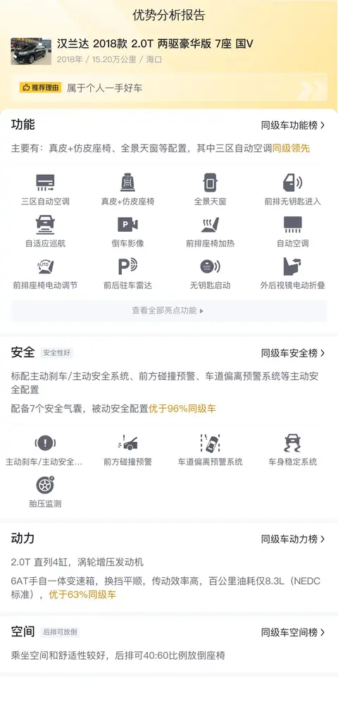 综上所述的新车含税价、用车成本、市场行情、优势分析、同款比价等数据仅供参考。在配置部分,因为二手车非标品,车辆可能会存在配置改装的情况,具体车况信息需要线下结合车辆实际情况进行综合参考。