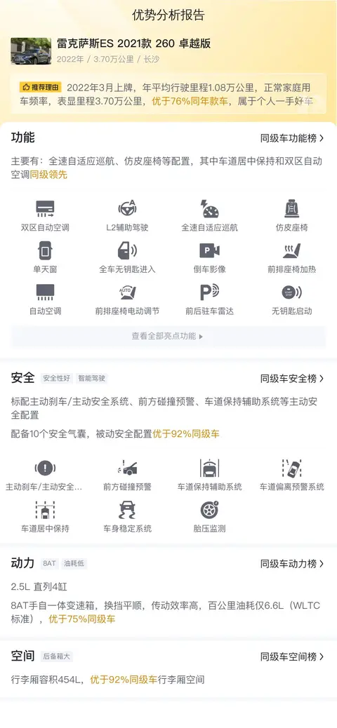 在二手车市场上,雷克萨斯ES 2021款 260 卓越版的行情也是挺不错的。它的报价在21.05万到26.16万之间,咱们说的这辆是22.68万,这个价格在市场里算是亲民的,毕竟它的车况好,用得也少。说到用车成本,这车的花费在同类车里算是偏下的。每年的油钱、保险和保养,开个一万公里,大约花个5187块,跑得多当然要多花点。这车油耗不高,保险价格也合理,保养起来也不算费钱,总的来说,养这车不费劲。