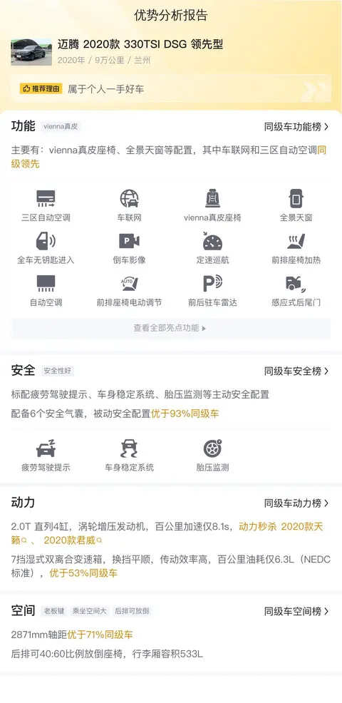 这款迈腾拥有出色的乘坐舒适度、宽敞的储物空间和卓越的动力性能,非常适合作为家庭用车。它精致的内饰设计和丰富的配置,如真皮座椅、全景天窗等,提升了驾乘的舒适感。宽敞的行李舱和合理的空间布局,满足了家庭出行的储物需求。2.0T发动机配合双离合变速箱,确保了充沛的动力和良好的燃油经济性,适合长途驾驶。然而,作为二手车,它也存在一些潜在问题,如里程数较高和可能的保养维修需求,购买前需谨慎评估。总体而言,这款迈腾是一款性能可靠、舒适实用的B级轿车,适合追求高品质生活的消费者。