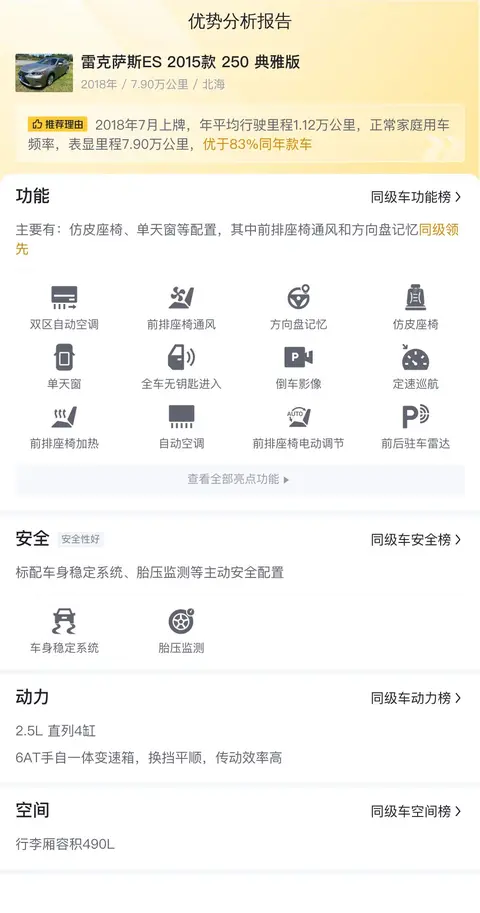 此款车型为雷克萨斯ES 2015款 250 典雅版,首次上牌时间为2018年7月,过户1次,车源地与上牌地均为北海,符合国V排放标准。车身颜色为银灰色,累计行驶里程为7.9万公里,表显里程低于同年款车均值。该车新车指导价为32.50万元,目前二手车报价14.38万元,首付4.31万元即可将其带回家。