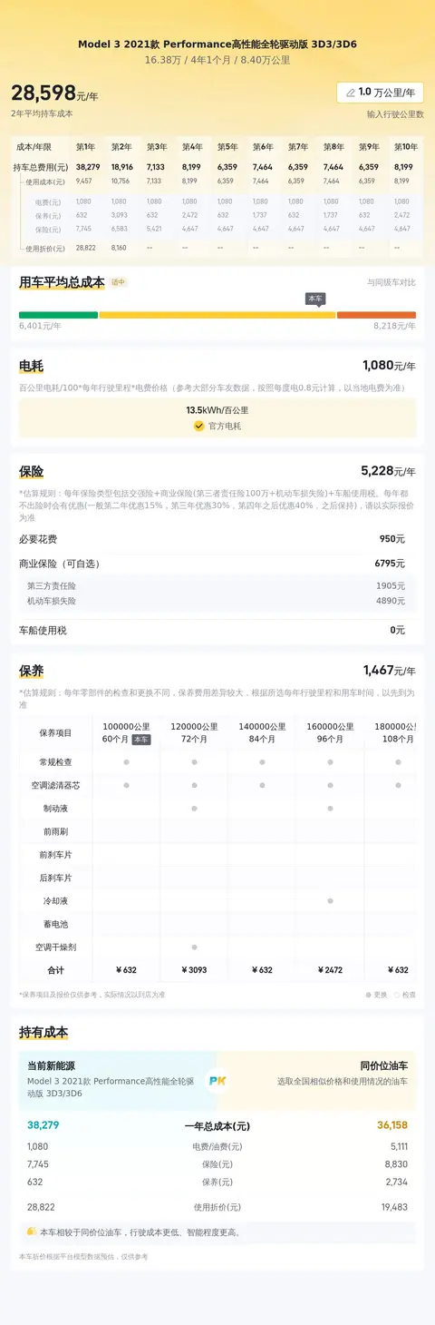 据估算,Model 3 2021款 Performance高性能全轮驱动版 的用车成本也偏低,因为它的用车成本是8615元/年,而同级车最低用车成本是8545元/年,最高是11844元/年。