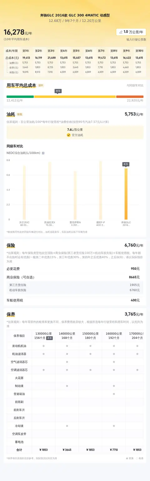 根据懂车帝平台数据显示,这台奔驰GLC 2016款 GLC 300 4MATIC 动感型的报价为12.68万,在同级别车型中价格非常有优势。年度用车成本方面,按照每年1万公里计算,每年燃油、保险和保养的综合用车成本约15607元,其中燃油费用约12160元,保险费用约3087元,保养费用约2060元(以上数据来自懂车帝平台,仅供参考,实际费用因使用情况而异)。
