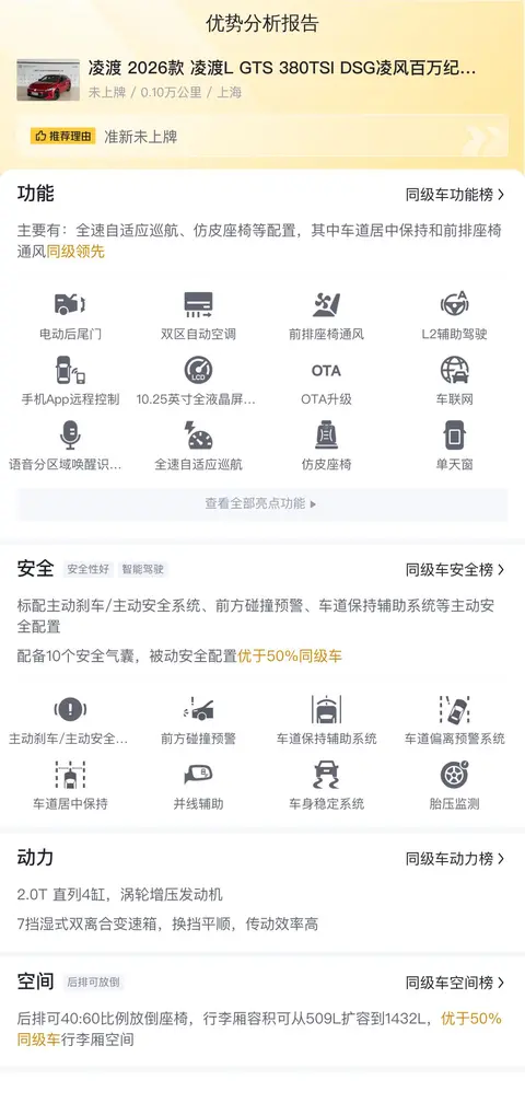 优势:价格实惠,配置实用。凌渡 2026款 凌渡L GTS 380TSI DSG凌风百万纪念版搭载的发动机动力强劲,百公里加速成绩优异。车内空间宽敞,乘坐舒适,无论是日常通勤还是长途旅行都能提供良好的驾乘体验。此外,车辆还配备了多种智能驾驶辅助系统,如ACC自适应巡航、车道保持辅助等,提升了驾驶的安全性和便捷性。
