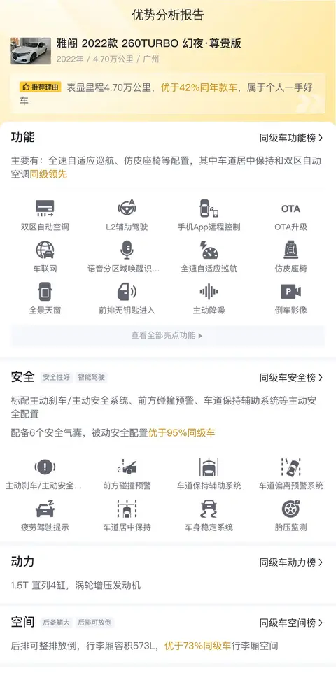 综上所述的新车含税价、用车成本、市场行情、优势分析、同款比价等数据仅供参考。在配置部分,因为二手车非标品,车辆可能会存在配置改装的情况,具体车况信息需要线下结合车辆实际情况进行综合参考。