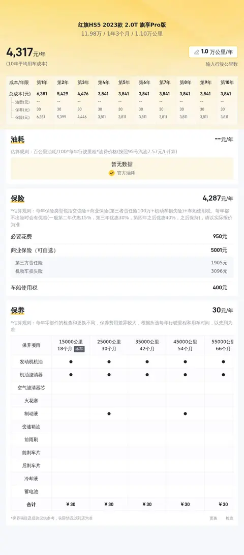 考虑到红旗HS5 2023款 2.0T 旗享Pro版的车龄、里程、过户次数等因素,预计两年后其售价为8万左右。红旗HS5 2023款 2.0T 旗享Pro版的10年平均用车成本约为11,987元/年,而同级车的最低10年平均用车成本约为10,664元/年,最高则约为13,701元/年。由此可见,红旗HS5 2023款 2.0T 旗享Pro版的用车成本在同级车中处于相对合理的水平。