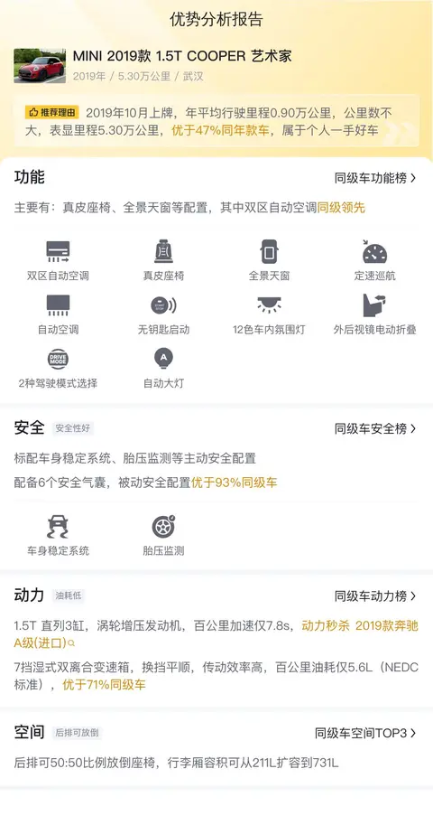 要说个性小车的代表,那必须得是MINI(图片|配置|询价)啊!自打1959年第一辆Mini诞生以来,它就一直是时尚与个性的代名词。它独特的小巧车身、标志性的圆形大灯,还有那丰富多彩的车身颜色,简直就是街头的艺术品。如今,MINI已经成了高端时尚小车的标杆,它不断推出各种联名款车型,像是时尚品牌、设计师合作款,每出一款都能引来一大波关注。今天要介绍的这辆二手MINI 2019款 1.5T COOPER 艺术家,报价10.9万,里程5.3万公里,还是国VI排放标准,性价比相当可以。