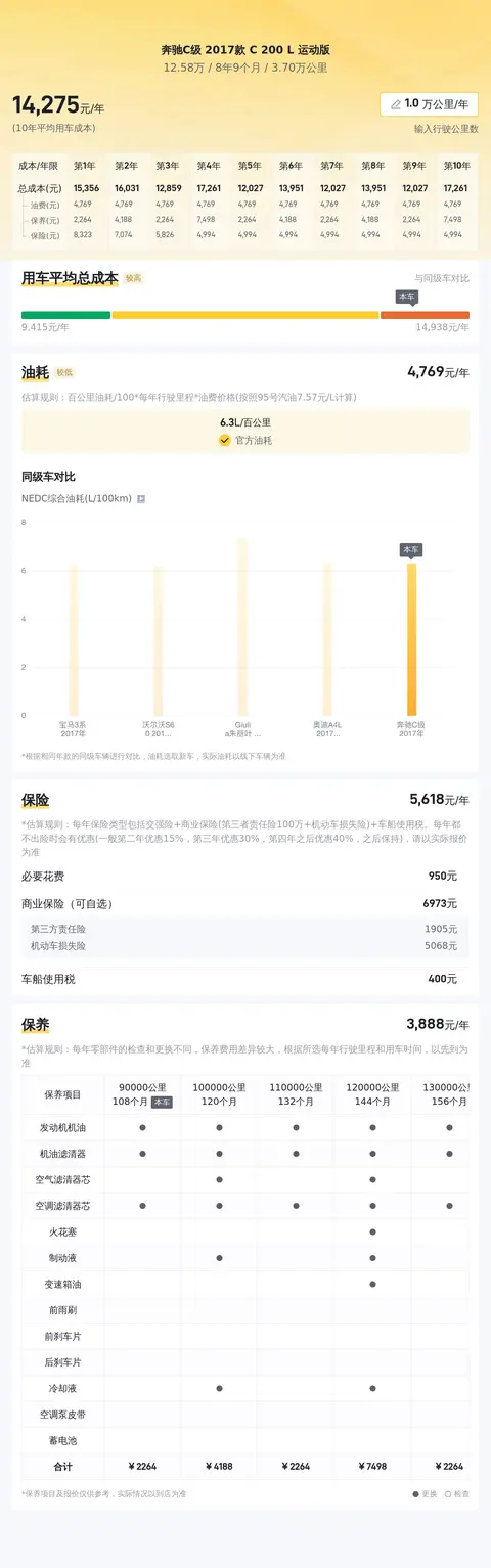 在用车成本方面,根据估算,这辆车的年均综合用车成本在1.4万元左右。这包括了油费、保险费、保养费等。具体的费用根据车主的实际使用情况会有所差异。