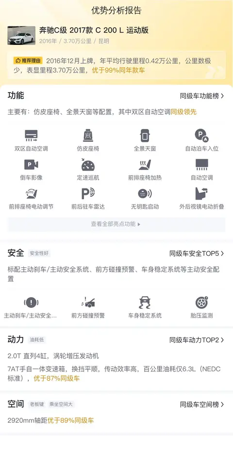 在配置方面,这辆奔驰C级配备了仿皮座椅、全景天窗等,其中双区自动空调更是同级领先。动力方面,搭载了2.0T直列4缸涡轮增压发动机,匹配7AT手自一体变速箱,百公里油耗仅为6.3L(NEDC标准),优于87%同级车。轴距2920mm,优于89%同级车,为乘客提供了宽敞舒适的乘坐空间。