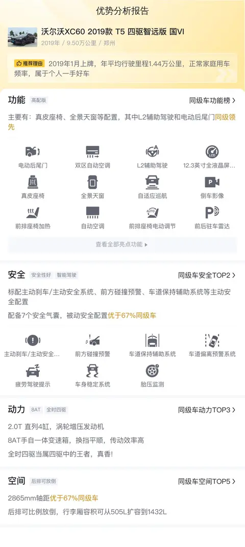 据估算,同级车的最低用车成本是6506元/年,最高是18771元/年,沃尔沃XC60 2019款 T5 四驱智远版 国VI是15177元/年,用车成本较高。