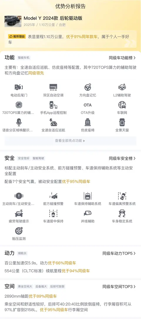 综上所述,这辆二手Model Y 2024款后轮驱动版在价格、配置、性能、空间和舒适性等方面都展现出了较强的竞争力。作为消费者,在购买决策时,建议您综合考虑个人需求、预算以及车辆的维护成本等因素。如果您追求先进的技术配置、长续航能力和舒适的驾乘体验,同时对价格较为敏感,那么这辆二手Model Y无疑是一个值得考虑的选择。