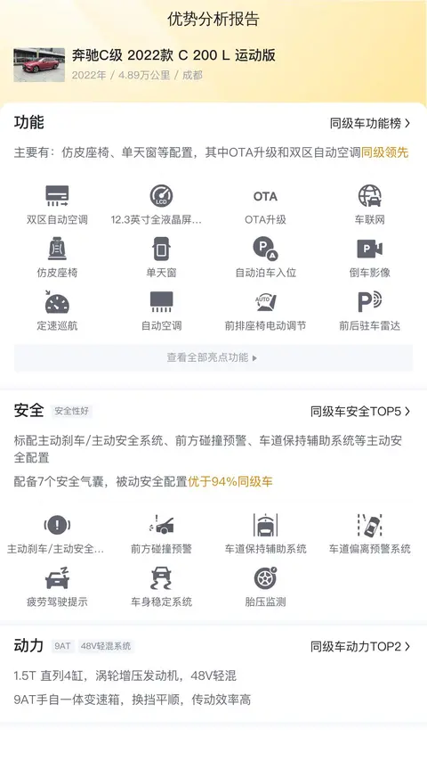 这辆二手奔驰C级 2022款 C 200 L 运动版是在2022年8月上的牌照,来自天府之国——成都,已经行驶了4.89万公里,恰到好处的里程数,既保证了车辆的性能,又留下了足够的空间给新主人去探索。车身红色,热情而不失庄重,仿佛是奔驰对生活的热爱与追求的颜色。有过一次过户记录,这说明它曾经被精心呵护过,交接棒已传,只待新主人续写辉煌。