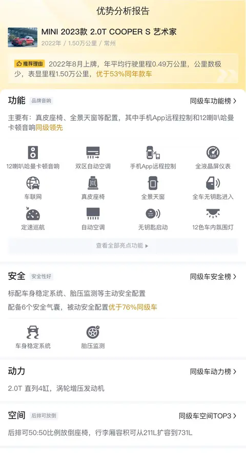 这辆MINI 2023款 2.0T COOPER S 艺术家优势方面,丰富的配置是一方面,更重要的是MINI这个车本身的工艺品质是延续豪华车标准制造的,所以从皮质的手感,到按键的阻尼,再到灯光的效果,都做的很讲究,甚至包括车内的按键都是钢琴键,每一个设计都透露着精致感,另外就是动力了,2.0T的发动机动力充沛,可以为驾驶者提供充足的超车信心。