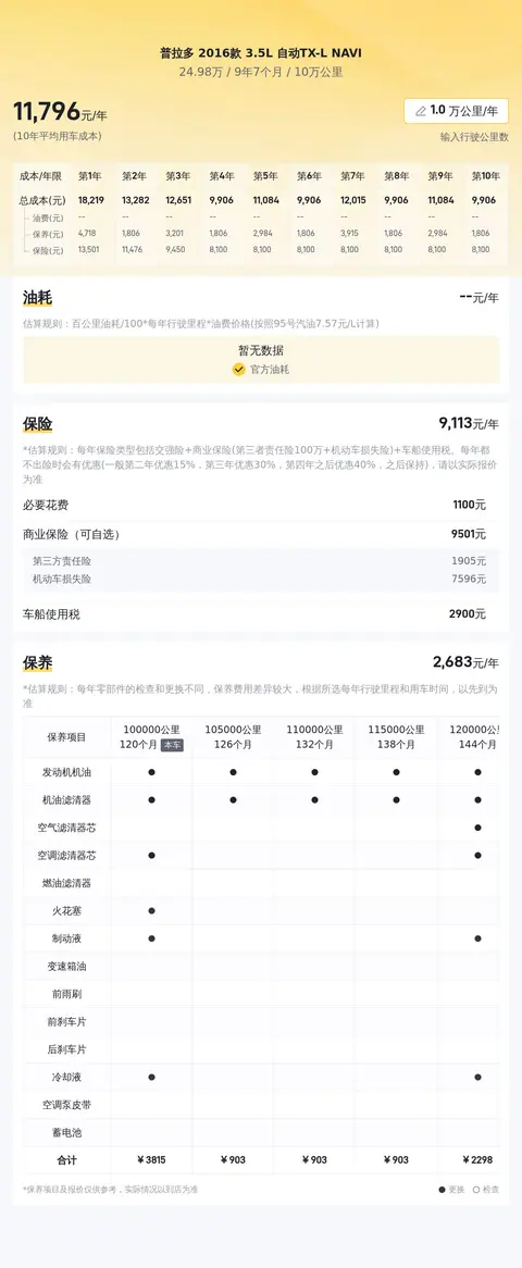 据估算,普拉多 2016款 3.5L 自动TX-L NAVI的用车成本是11170元/年,用车成本不算低,但也是正常水准。