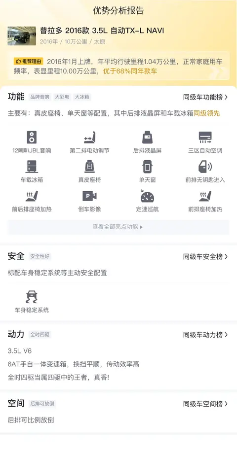 综上所述的新车含税价、用车成本、市场行情、优势分析、同款比价等数据仅供参考。在配置部分,因为二手车非标品,车辆可能会存在配置改装的情况,具体车况信息需要线下结合车辆实际情况进行综合参考。