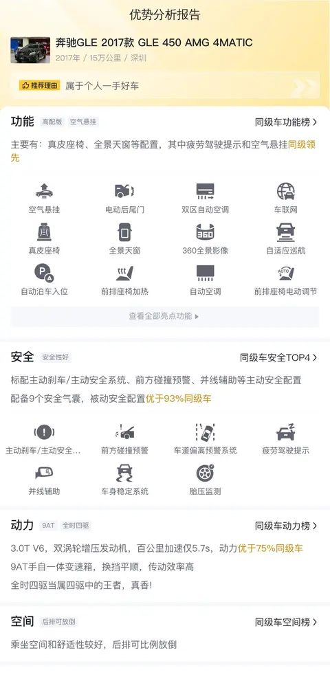 优势:作为一台豪华中大型SUV,奔驰GLE 2017款 GLE 450 AMG 4MATIC外观保持了较好的成色,内饰主要功能均完好,车况基本没问题。报价24.8万,价格低于市场行情价,比较实惠。同时它的保值率也较高。