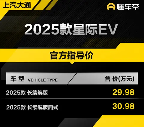 [懂车帝原创 产品] 日前,我们从上汽大通MAXUS官方获悉,2025款星际EV(图片|配置|询价)上市,共推出长续航版和长续航版厢式两个车款,指导价分别为29.98万元和30.98万元。本次年度改款,新车针对配置进行调整,中控屏尺寸由2024款的7英寸升级至10英寸,CLTC续航里程仍为515公里。