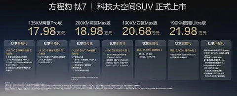 9月9日,方程豹品牌旗下的全新中大型SUV,方程豹钛7正式上市,新车的售价区间为17.98-21.98万元。