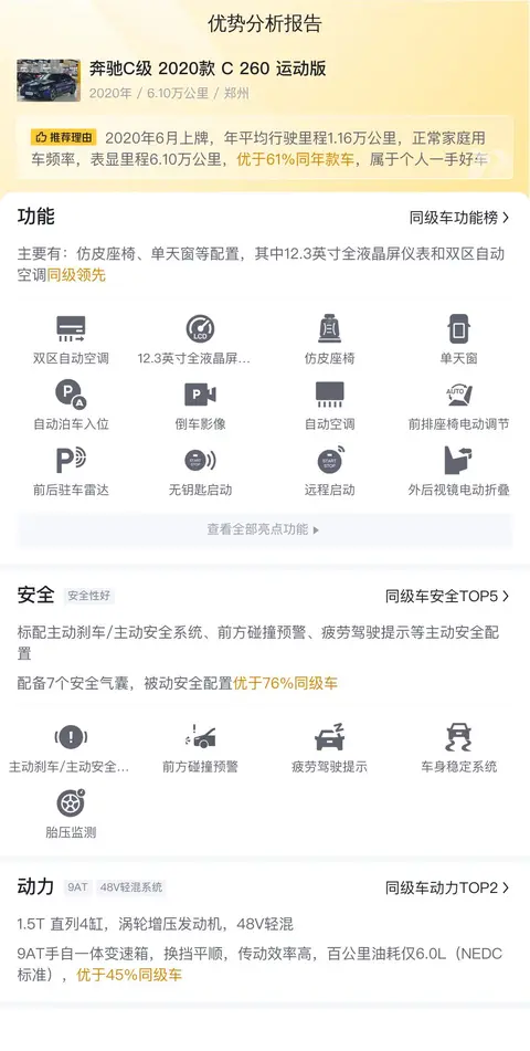 在配置部分,这款车拥有仿皮座椅、单天窗等配置,其中12.3英寸全液晶屏仪表和双区自动空调更是同级领先。值得一提的是,这款车搭载了1.5T直列4缸涡轮增压发动机和48V轻混系统,配合9AT手自一体变速箱,不仅保证了强劲的动力输出,还实现了出色的燃油经济性,百公里油耗仅为6.0L(NEDC标准)。这一动力组合让C级在保证驾驶乐趣的同时,也兼顾了日常使用的便利性和经济性,是一个非常不错的选择。
