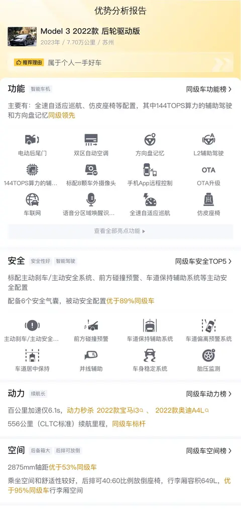 这辆Model 3 2022款 后轮驱动版来自美丽的江南水乡——苏州,车牌也是当地的。这意味着,如果您是苏州本地人,办理过户手续会更加方便快捷。至于过户次数,这辆车至今尚未有过过户记录,是一手车,这在二手车市场上相对较少见,也意味着车辆的历史更加简单明了。接下来,我们来看看这辆车的行驶里程和使用时间。自2023年6月上牌以来,这辆车已经行驶了7.70万公里。一般来说,家用车的年平均行驶里程约为1万公里。据此计算,这辆车的年均行驶里程约为3.8万公里,使用频率较高。可能是车主日常通勤距离较远,或者喜欢自驾旅行所致。需要注意的是,频繁使用可能会增加车辆部件的磨损,降低电池健康度,这些因素在评估车况时不容忽视。