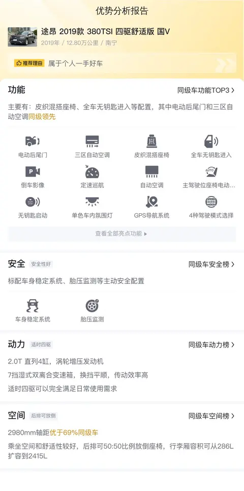 综上所述的新车含税价、用车成本、市场行情、优势分析、同款比价等数据仅供参考。在配置部分,因为二手车非标品,车辆可能会存在配置改装的情况,具体车况信息需要线下结合车辆实际情况进行综合参考。