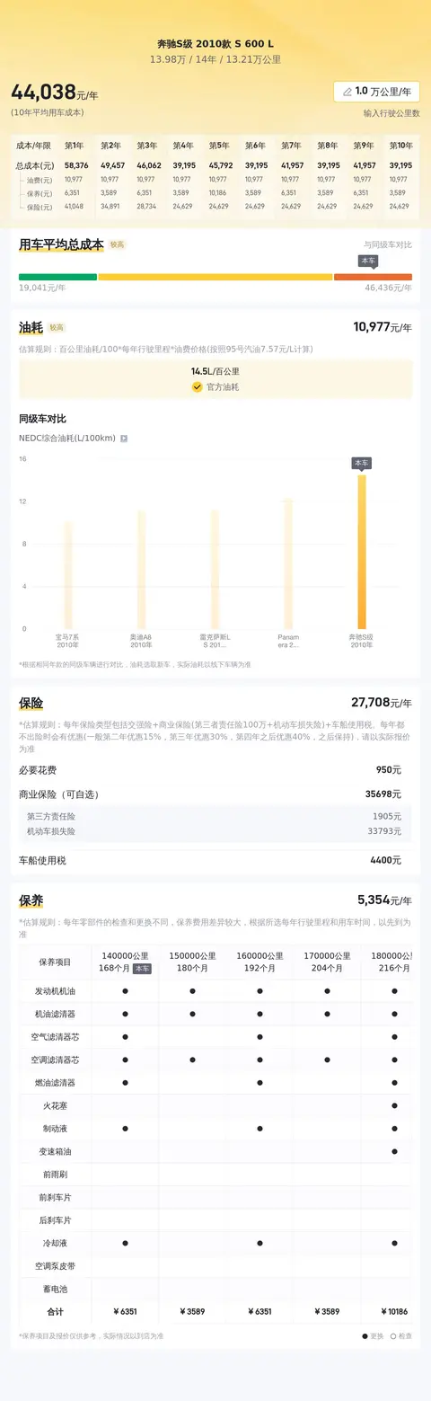 根据懂车帝的大数据分析,这款二手奔驰S级2010款S600L的市场价格区间为13.88万至18.68万,具体价格因车况而异。至于用车成本方面,这款车型的百公里油耗约为14.5升,按照一年行驶2万公里计算,每年的油费大约需要2.5万元。此外,保险费用一年约1.2万元,保养费用一年约8000元,其他费用根据个人情况而定,总计一年的用车成本大约在4.5万元左右。当然,作为一款豪华车型,这样的用车成本是可以理解的。