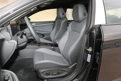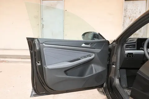 车身侧面是我觉得最耐看的角度。溜背式的车顶线条从 B 柱开始慢慢往下收,搭配无框车门,这种设计在同级别合资轿车里可不多见,时尚感直接拉满。车门用的是传统门把手,朋友一开始还担心无框车门会不好用,实际体验下来,开关门都很顺畅,而且不像隐藏式门把手那样怕出故障,风阻方面也没什么影响,能感觉到设计师在美观和实用之间找了个很好的平衡点。另外,车身侧面还有一条硬朗的腰线,从车头一直延伸到车尾,视觉上把车身拉得更长,再加上 18 英寸的轮毂,整体比例特别协调。