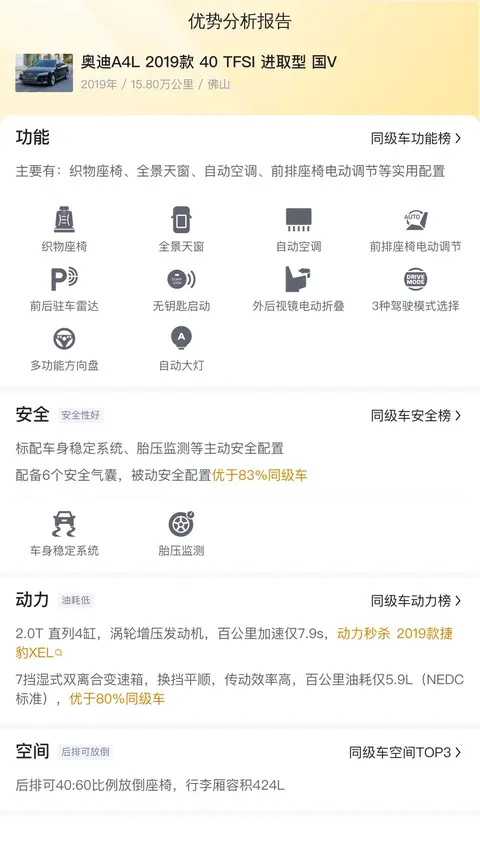 这辆奥迪A4L 2019款 40 TFSI 进取型 国V是一辆前驱中型轿车,它的车源地和上牌地都是佛山。2019年3月首次上牌,个人一手车,行驶里程为15.8万公里,符合国V排放标准。这辆车的官方指导价为30.08万元,目前二手车报价为10.68万元,比新车价格优惠了19.4万元,分期购车首付3.2万元即可。