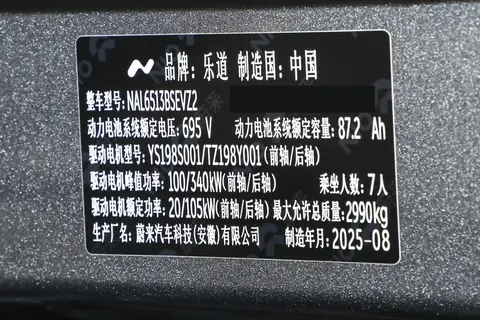 其车辆参数为:制造国中国,整车型号NAL6513BSEVZ2,动力电池系统额定电压695V、额定容量87.2Ah,驱动电机型号YS1985001/Z198Y001(前轴/后轴),峰值功率100kW/340kW(前轴/后轴),额定功率20kW/105kW(前轴/后轴),乘坐人数7人,最大允许总质量2990kg,生产厂为蔚来汽车科技(安徽)有限公司,制造年月2025-08。