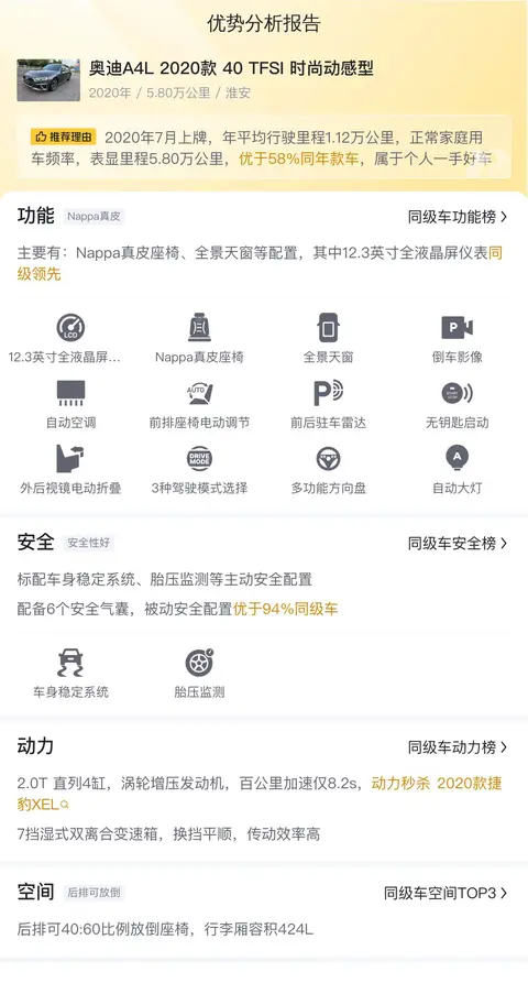 总的来说,这款二手奥迪A4L 2020款 40 TFSI 时尚动感型凭借其合理的价格、稳定的车况、优秀的动力性能、舒适的内部配置以及合理的用车成本,无疑是一个值得考虑的选择。如果你正在寻找一款性价比高的豪华轿车,那么这辆奥迪A4L或许就是你的理想之选。