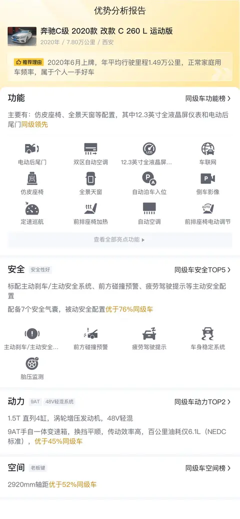 首先我们先了解一下这辆二手奔驰C级 2020款 改款 C 260 L 运动版车况信息:
