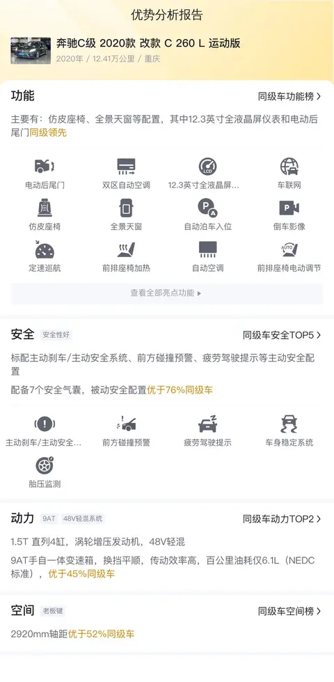 奔驰C级2020款改款C260L运动版在继承了奔驰品牌豪华特质的同时,也具备了一些独特的竞争优势。首先,其1.5T发动机与48V轻混系统的搭配,在保证动力充沛的同时,也兼顾了燃油经济性,这对于追求高效节能的现代消费者来说,无疑是一个巨大的吸引力。其次,车内豪华舒适的内饰以及宽敞的空间布局,使得它在同级别车型中具有较强的竞争力。然而,这款车也存在一些不足之处。例如,部分驾驶者反映在低速行驶时,车辆的顿挫感较为明显,这可能与48V轻混系统的介入有关;另外,内饰虽然豪华,但也有用户反映部分塑料件质感稍显廉价。