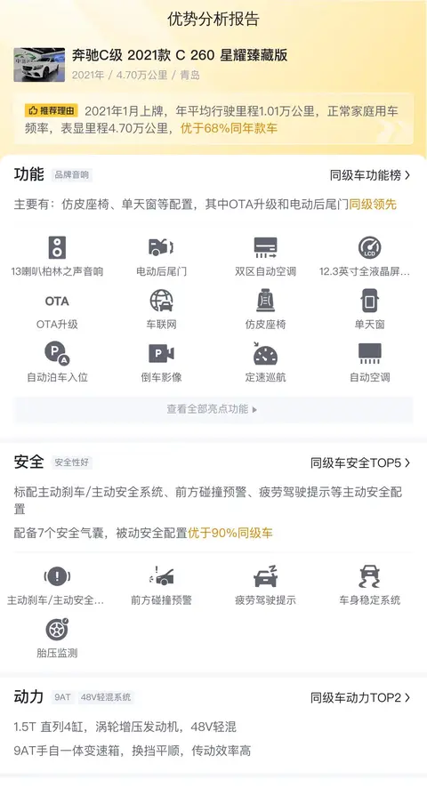 综上所述,这款2021年款的奔驰C级C 260星耀珍藏版是一款集豪华与性能于一体的车型。它搭载了先进的动力系统,提供了强劲的动力输出和良好的燃油经济性。车身外观采用了独特的设计元素,如闪钻格栅和夜色组件,彰显了车主的个性和品味。内饰方面,高级材质和精致工艺营造了奢华氛围,配备的高级音响系统和智能驾驶辅助技术则提升了驾乘体验。在安全配置上,它同样表现出色,配备了多项主动和被动安全措施,确保行车安全。总的来说,这款车型凭借其出色的性能、豪华的配置和合理的价格,在豪华中级车市场中具有较高的性价比和市场竞争力,是追求品质生活的消费者的理想选择。如果您正好在找这样的车型,那这辆车值得考虑一下。