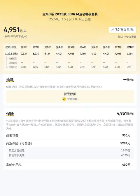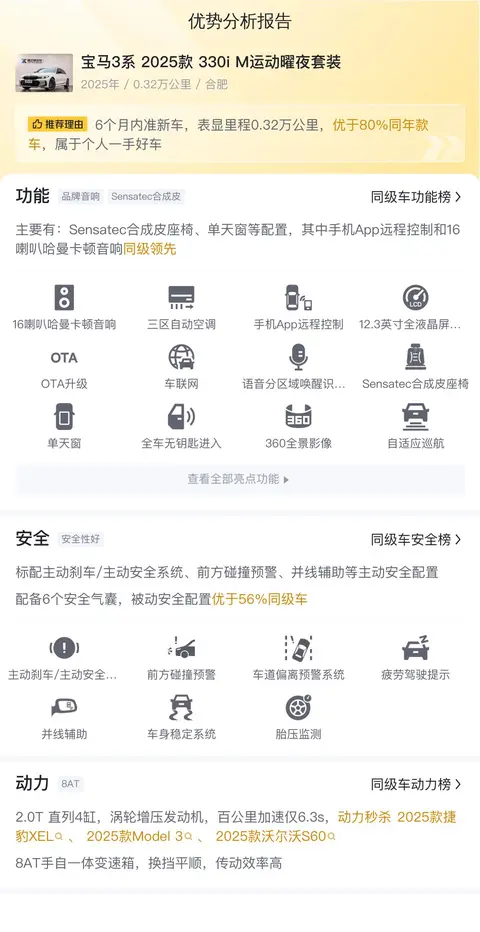 这辆宝马3系 2025款 330i M运动曜夜套装,定位是中型车,车身外观颜色是白色,内饰是深色配色。车源地和上牌地都在合肥。至今累计行驶里程是0.3万公里,该车符合国VI排放标准。2025年4月首次上牌,期间0过户。这辆车的新车含税价是38.37万,目前二手车售价是25.5万。
