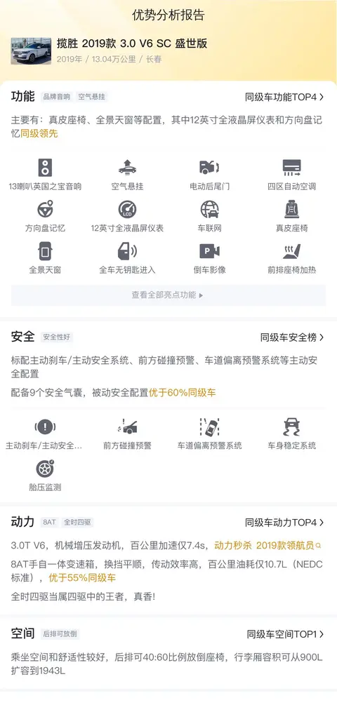 综上所述的新车含税价、用车成本、市场行情、优势分析、同款比价等数据仅供参考。在配置部分,因为二手车非标品,车辆可能会存在配置改装的情况,具体车况信息需要线下结合车辆实际情况进行综合参考。