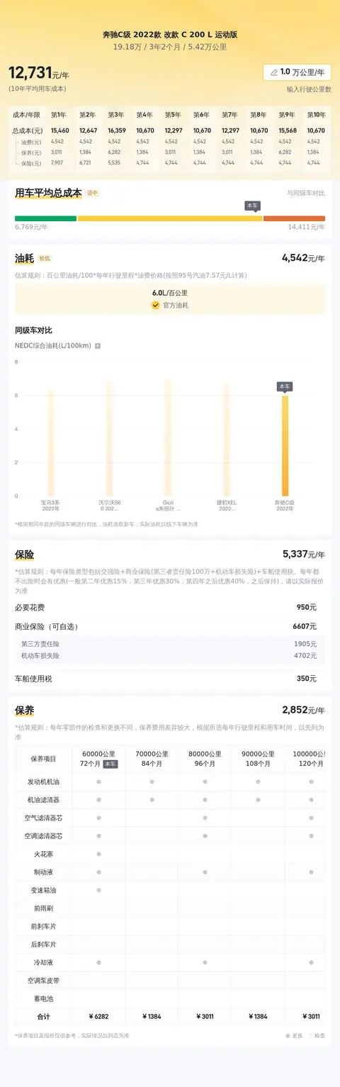 在用车成本方面,根据数据显示,这辆奔驰C级运动版轿车的年均综合用车成本约为1.3万元。这一数字涵盖了燃油、保险以及保养等方面的费用支出。相比之下,与同级别车型相比,该车的用车成本处于适中的水平。而与同级别车型相比,该车在安全气囊/帘、车道偏离预警系统等方面具有一定的优势。此外,在舒适配置方面,该车同样表现出色,其座椅材质、空调类型等功能配置也优于不少同级别车型。总的来说,这辆二手奔驰C级运动版轿车是一款集豪华与性能于一身的座驾。它不仅拥有出色的外观设计和豪华的内饰配置,还具备卓越的驾驶性能和舒适的乘坐体验。如果您正在寻找一款既能满足日常出行需求又能展现个人品味的座驾,那么这辆二手奔驰C级运动版轿车将是一个不错的选择。